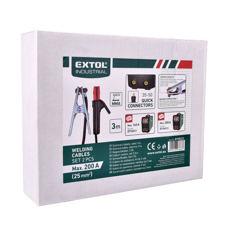 Главни технички параметри: 25mm2, 35-50, за заварување до 200А, 3m гумиран кабел за заварување со 200А месинг клешта, 3m гумиран кабел за заземјување со 200А штипка.