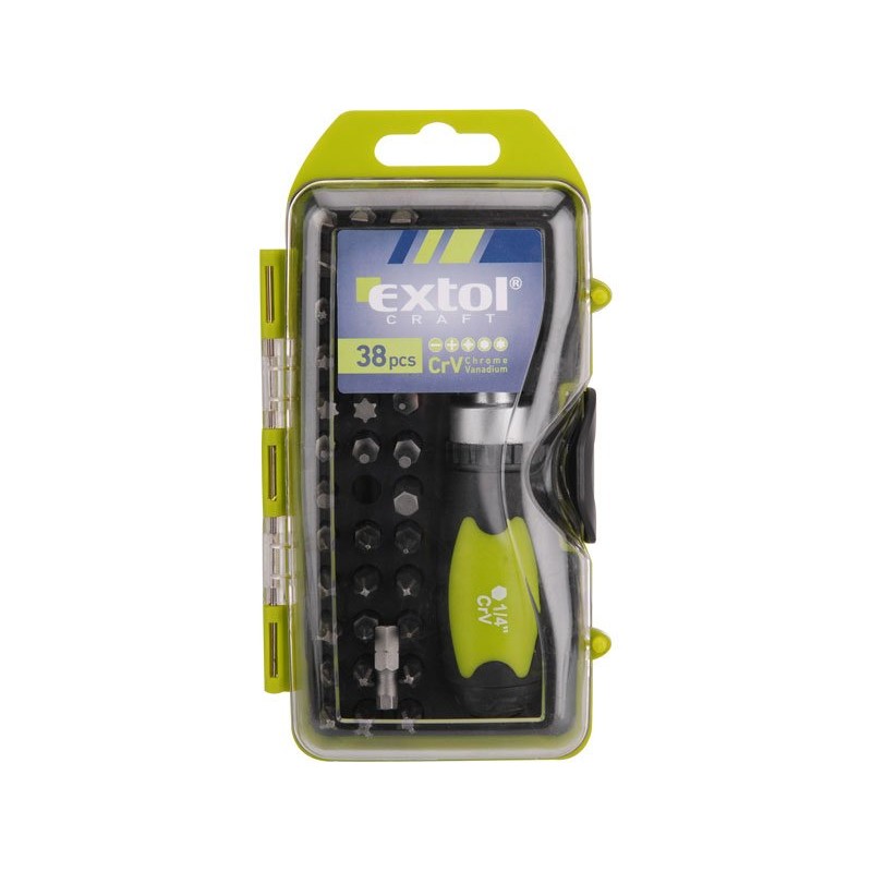 Главни технички параметри: (-) 3-4-5-6-6-7mm, PH 0-1-1-2-2-2-3-3, PZ 0-1-1-2-2-2-3-3, HEX 1,5-2-2,5-3-4-5-6mm, T 8-10-15-20-25-27-30-40, одвртувач со крцкало со битови, сет 1/4" 6-стран, материјал: CrV