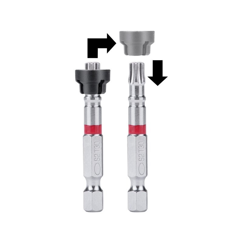 Битовите се направени од материјал S2 челик кален до тврдина 61-62 HRC јакост 13,2-14,7 Nm. Магнетната капа со помош на пружина налегнува на главата на штрафот колку што е потребно. Екстра силниот магнет држи и многу долги штрафови без проблем и овозможува ракување во различни правци без потреба од држење на штрафот.