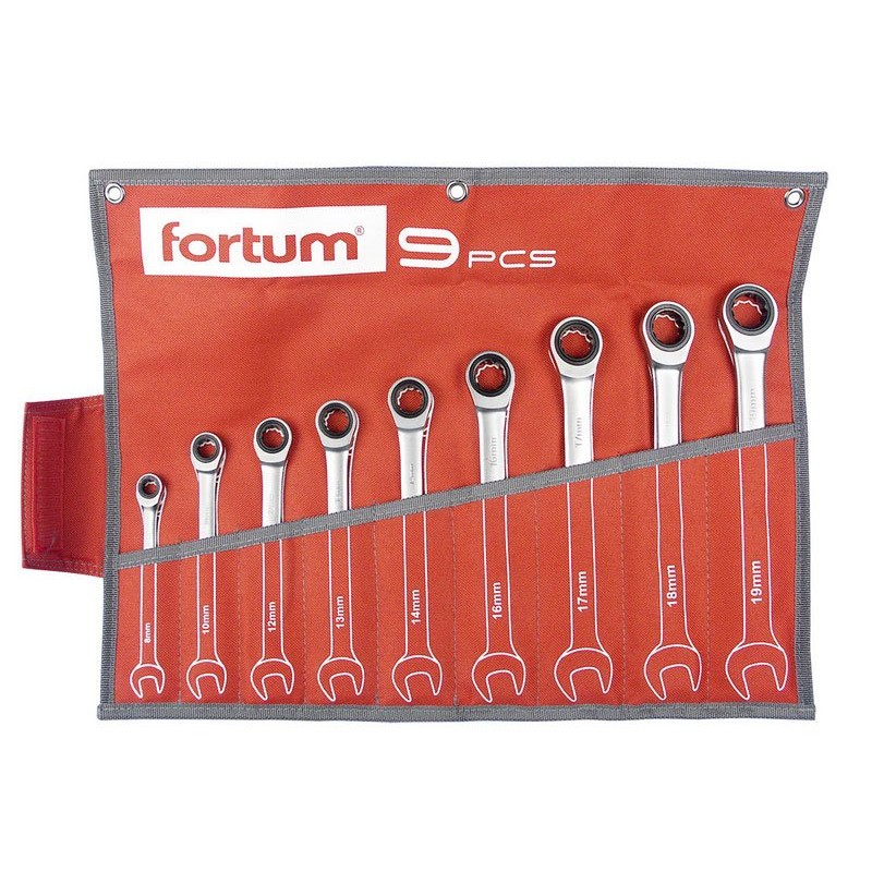 Со клучевите со крцкало, Fortum ќе ја спознаете вистинската слобода при работа. Оставете раката сама да си ја пронајде најудобната положба. Врвно квалитетен хром-ванадиум челик 61CrV5, со посебно калени заби на механизмот-крцкало. Со овој сет добивате и 2 подарока. Покрај фиксниот мултифункционален држач за клучеви, добивате и футрола од високо квалтитетен синтетички материјал ForDure™ за на ѕид. Главни технички параметри: 8-10-12-13-14-16-17-18-19mm материјал: CrV/S2