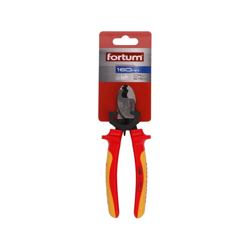 Fortum клештите се VDE сертифицирани за работа под напон до 1000V. Секое парче е поединечно тестирано под напон од  10 000V. Технички податоци: 160m опис: max дијаметар  на кабел 9.5 mm материјал: 61CrV5 стандарди: 1000V, GS / VDE