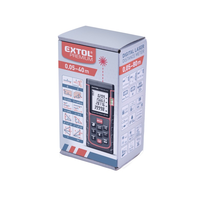 Главни технички параметри: должина на мерење 0,05-40m, точност на мерење +-1,5mm, минимално растојание 1mm, батерии 2x1,5V AAA, капацитет на батерии: за 5000 мерења, за внатрешна употреба, избор на датум, осветлување на дисплеј, звучен сигнал, единечно/континуирано мерење, мерење на должина, површина и волумен тип на ласер II. класа 620-690 nm,<1mW, тип на дисплеј четириреден со осветлување, работна температура 0-45°C, конверзија на мерни единици m/ft/in/ft-in, тежина 98g без батерии, прибор: најлон футрола, ремче, 2 батерии ААА. Автоматско ласерско исклучување за 30 секунди, автоматско исклучување за 3 мин. неактивност за заштита на животниот век на батеријата. тежина 98gr без батерија