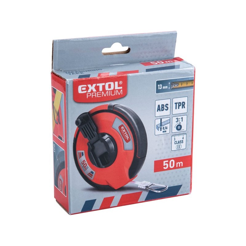 II класа за точност, должина 50m, ширина 13mm, облога од ABS/гума комбинација, со внатрешен механизам за брзо влечење со размер 3:1