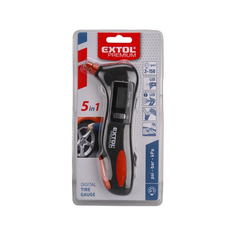 Алатка за итни случаи, како сообраќајни незгоди на пат и сл. Главни технички параметри: Пневматски мерач за итни случаи, 5 во 1, дигитален.5 функции: мерач на притисок во гуми 3-150PSI, единици мерки (psi, bar, kPa), LED светло бело, LED светло црвено, кршач на стакло(од автомобил) и нож за сечење на безбедносни појаси.